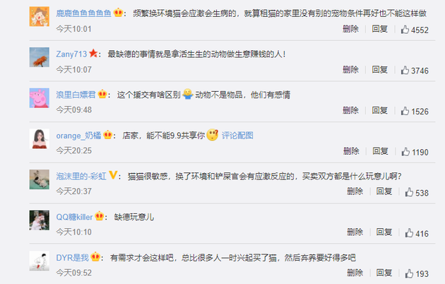 科创 共享猫咪9块9租一天:是漠视生命吗? 2021-03-10 10:03:36 分享 来源:新浪科技3月9日晚间消息,近日,有媒体报道称,在成都339购物中心,出现了多个“共享猫咪”的广告招牌,招牌上写着:9块9带猫咪回家陪你。#共享猫咪9块9租一天#话题登上热搜。网友对此表示称“频繁换环境猫会应激会生病的,就算租猫的家里没有别的宠物条件再好也不能这样做”、“最缺德的事情就是拿活生生的动物做生意赚钱的人!”也有网友认为:“有需求才会这样吧,总比很多人一时兴起买了猫,然后弃养要好得多吧。”