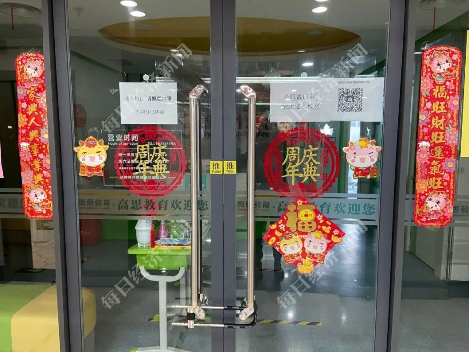 位于海淀黄庄的多家教育机构门上,都贴着疫情防控提示。图片来源:每经记者 宋可嘉 摄