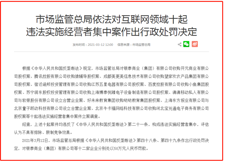 炣燃科技3月12日讯(宏斌)今天,市场监管总局发布了《依法对互联网领域十起违法实施经营者集中案作出行政处罚决定》,显示苏宁、腾讯以等10家商业巨头因参与股权收购涉嫌违法而被重罚。