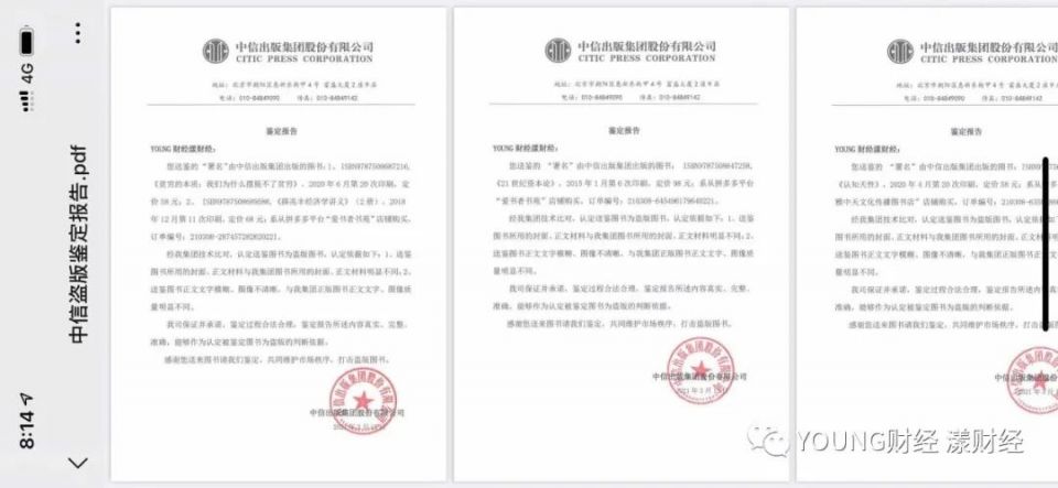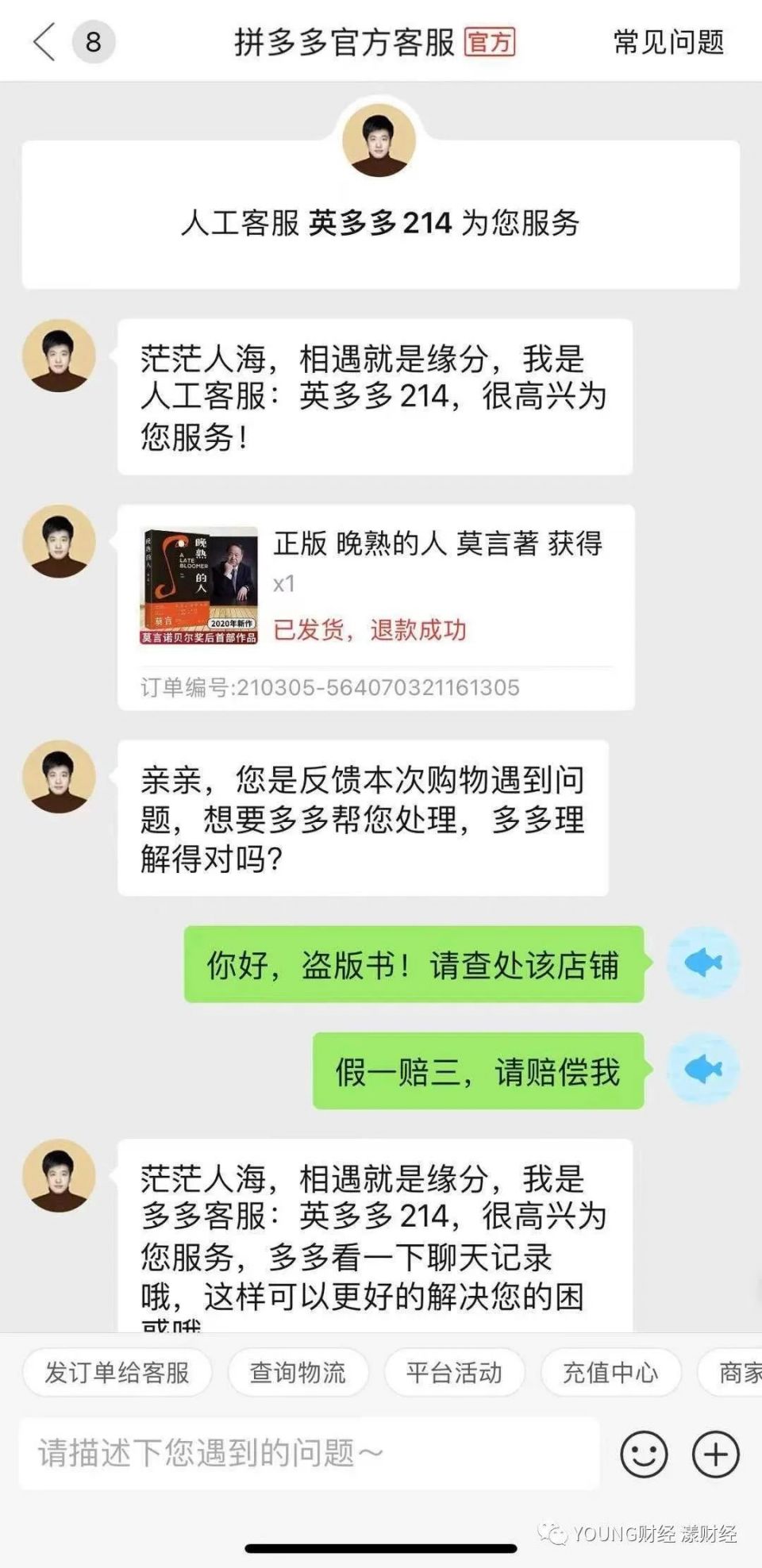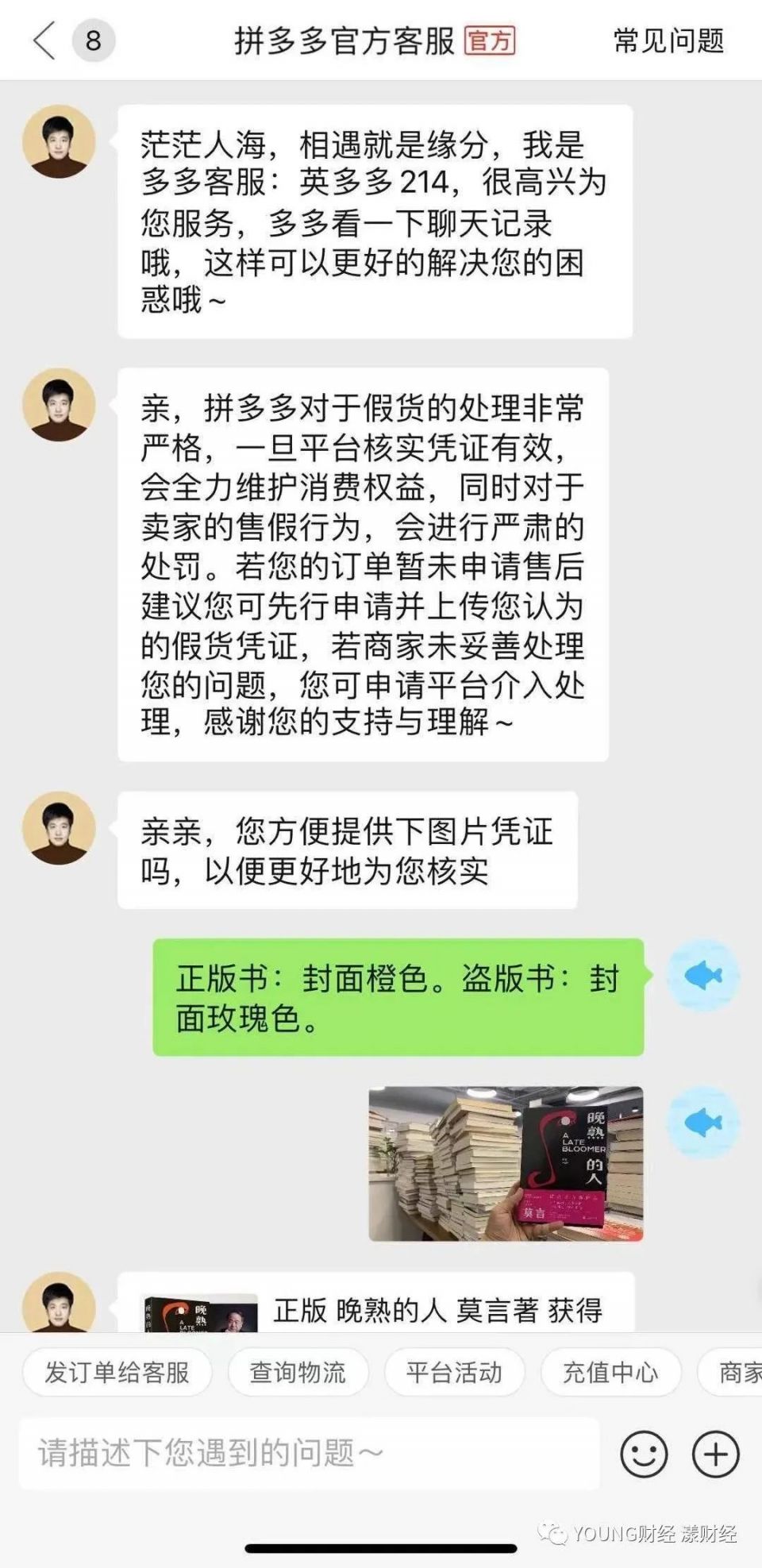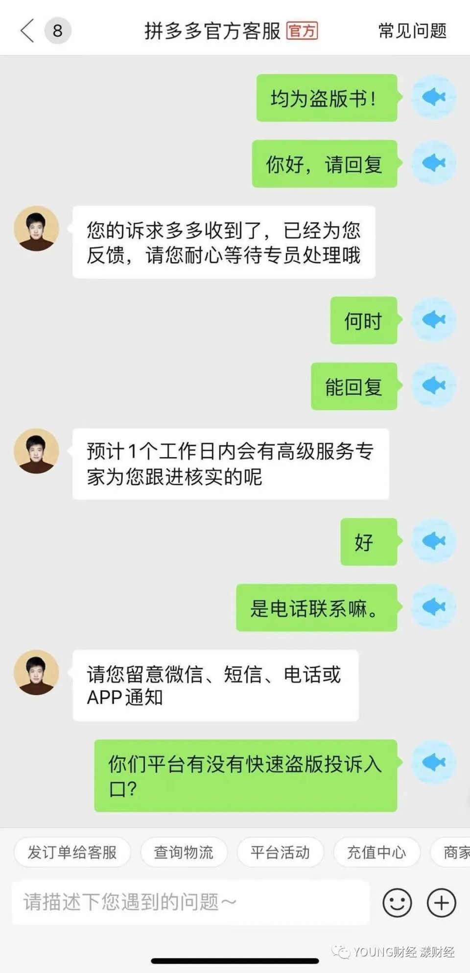 YOUNG财经在拼多多上采购了1000本书,实际送到574本。经过多方鉴别发现盗版书507本。我们发起了跟店铺客服、平台方客服的投诉,店铺大多并不承认,以“不喜欢可退货”等结束对话;客服则告知我们:盗版书不是假货。