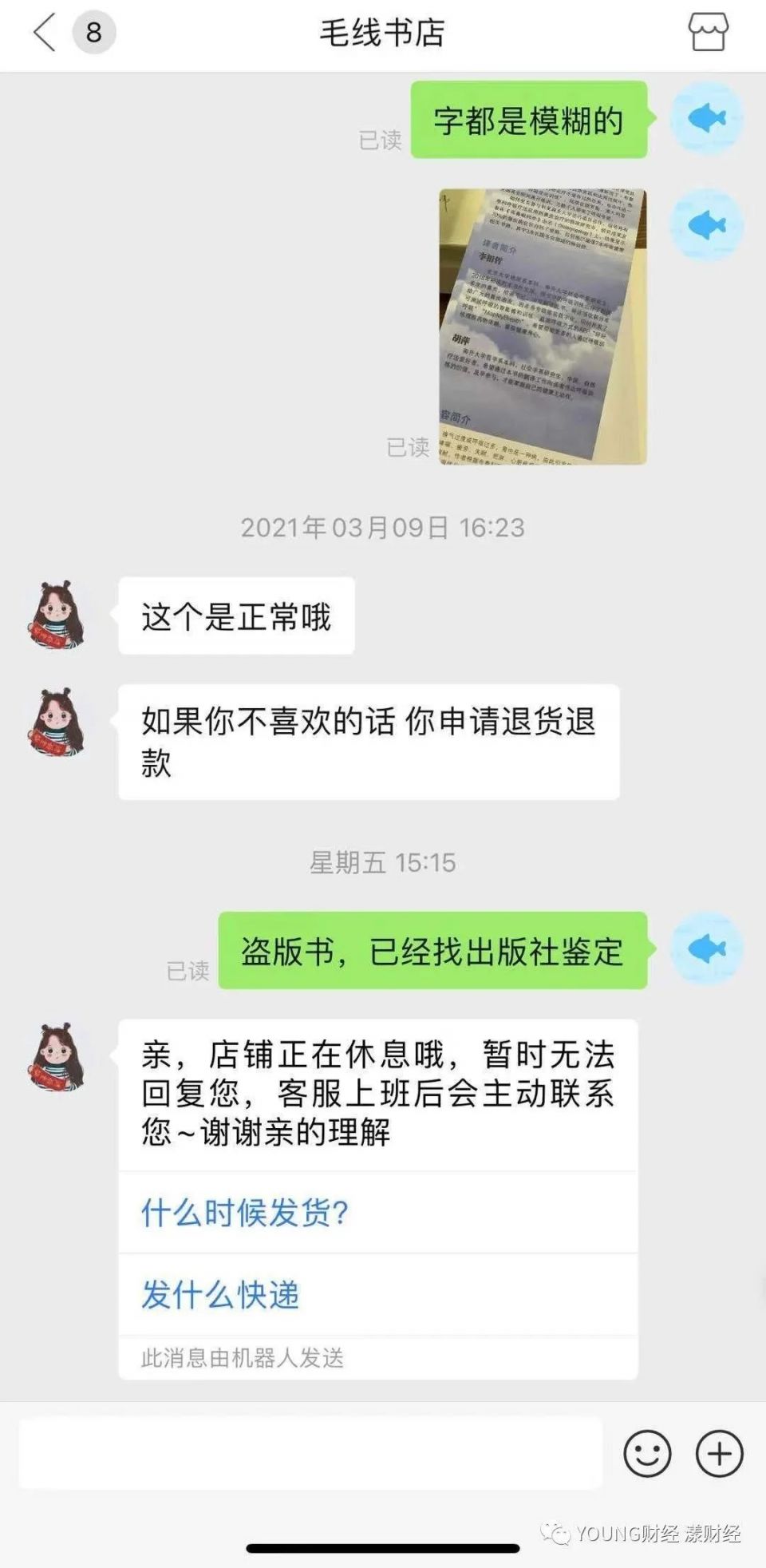 YOUNG财经在收到盗版书之后,与平台店铺和客服进行了投诉。有部分店家非常自信,当我们发送订单告知书籍为盗版的时候,店铺客服会非常理直气壮地回复:是正版亲;而当我们进一步提醒已经把书送到出版社鉴定为盗版时,店铺客服回复:亲如果不喜欢可以选择退货。因为这些书籍为盗版书,我们送出版社鉴定之后,按照要求是被回收销毁的,在回复对方“盗版书已被没收,无货可退”且要求店铺“假一赔十”后,对方客服都拒绝赔付,并且要求买家去平台投诉。