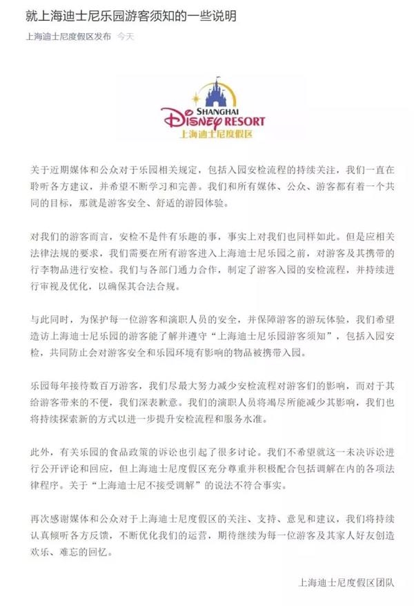 原标题:迪士尼最新回应:不接受调解说法不符合事实 对安检带来的不便深表歉意