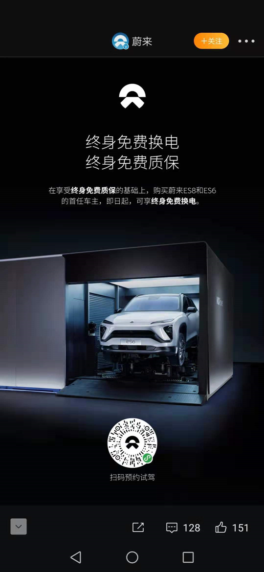 炣燃科技8月25日讯 2019年8月24日中午12点左右,蔚来汽车官网微博发布公告,称蔚来车主权益再升级,在享受终身免费质保基础上,所有现有和新购买蔚来ES8和ES6的首任车主,即日起可享终身免费换电。