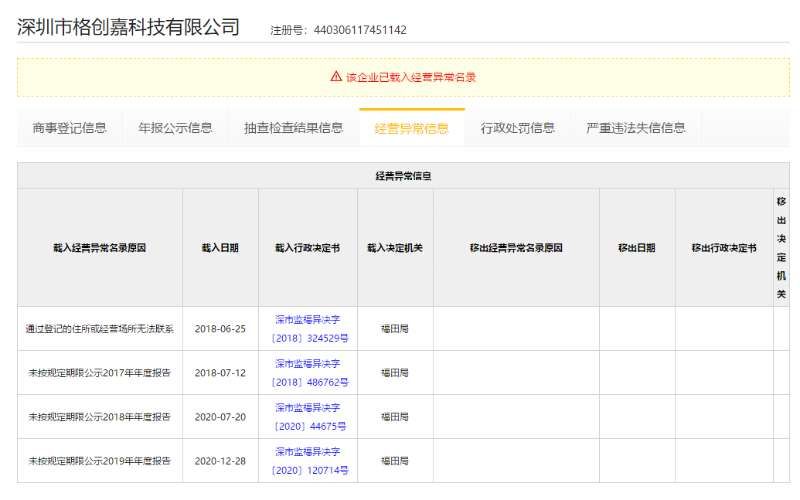 工商档案显示,深圳格创嘉公司目前有四条经营异常信息,2018年6月25日,该公司因“通过登记的住所或经营场所无法联系”,被深圳福田市场监管局首次载入经营异常名录,至今未被移出。此外,该公司还因未按规定期限公示2017年、2018年、2019年年度报告三次被载入经营异常名录。
