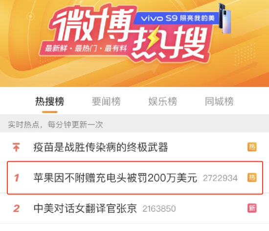 冲上热搜!苹果因不附赠充电头被罚200万美元(约合1300万元人民币)。