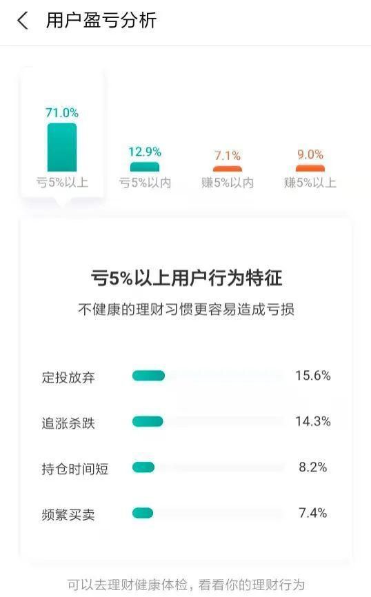 全体投资者用户中,赚了5%以上的投资者仅占9%。比股市谚语“一赚二平七亏”更加惨烈。如果你只是买了余额宝,就能战胜90%的人。