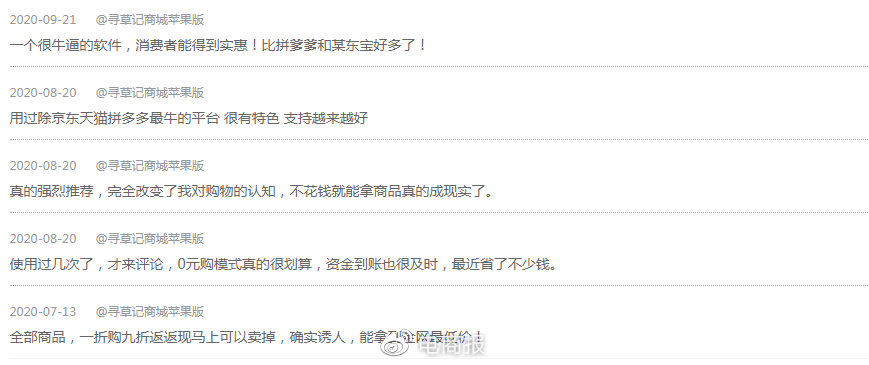 在“寻草记”,没有返回的订单,叫Freebuy订单。而且,Freebuy订单在会员之间可以转让交易的,也就是买卖双方谈好了价格后,售卖方得到协定交易额,购买方得到订单等待金额返还——因为有0元购作为前提,Freebuy订单就算是打折卖出,对于出售者而言也是有利可图的。