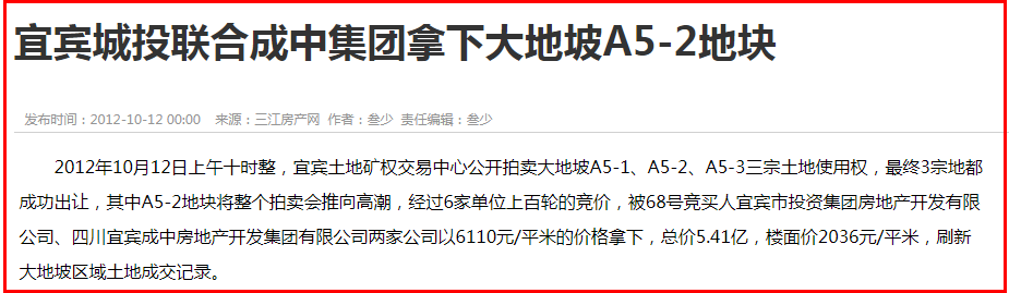 据媒体报道,2012年10月12日上午十时整,宜宾土地矿权交易中心公开拍卖大地坡A5-1、A5-2、A5-3三宗土地使用权,最终3宗地都成功出让,其中A5-2地块将整个拍卖会推向高潮,经过6家单位上百轮的竞价,被68号竞买人宜宾市投资集团房地产开发有限公司、四川宜宾成中房地产开发集团有限公司两家公司以6110元/平米的价格拿下,总价5.41亿,楼面价2036元/平米,刷新大地坡区域土地成交记录。