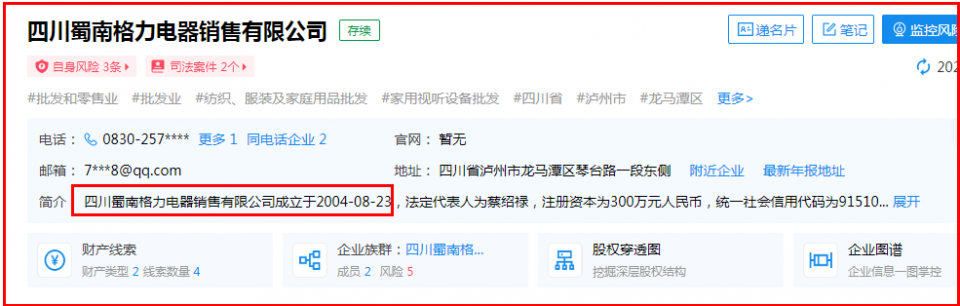 天眼查显示,四川蜀南格力电器销售有限公司的企业与格力电器在股权上并无直接的隶属。但其经营范围只有“销售格力电器”。