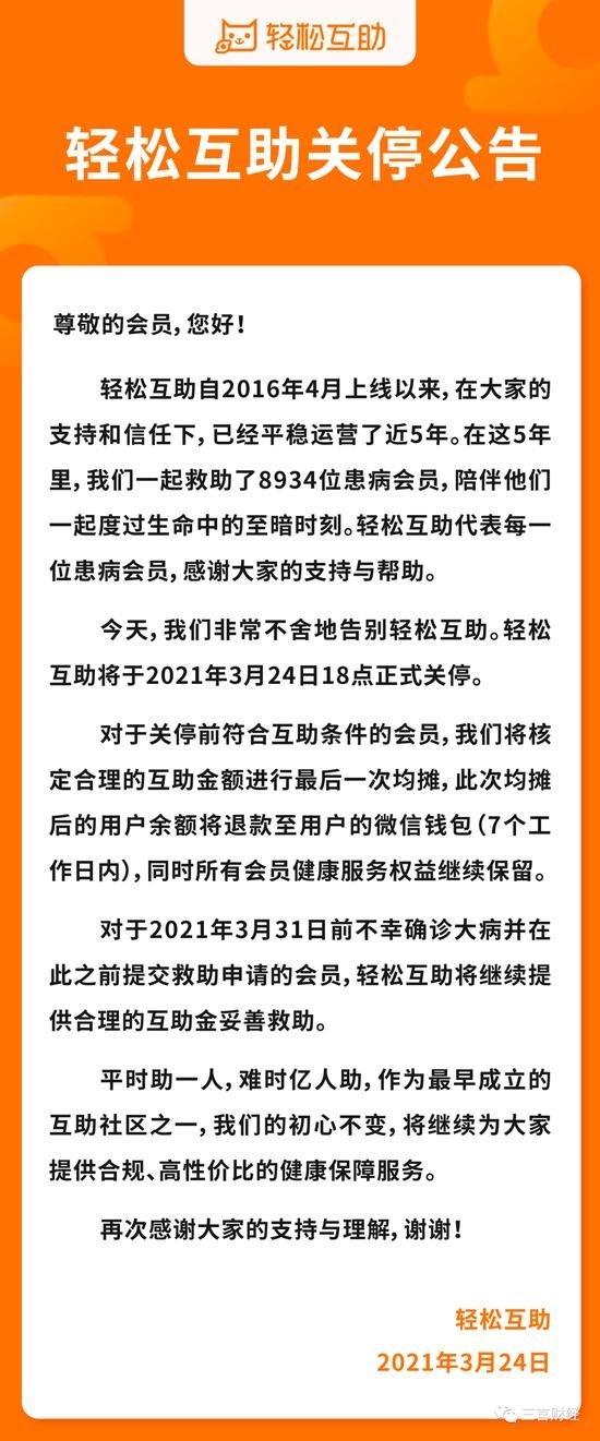 三言财经消息,3月24日,轻松互助宣布将于2021年3月24日18点正式关停。