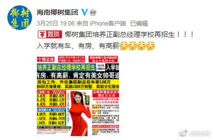 商业 椰树集团再发正副总招聘启事:此前招聘要求不顾家引争议 2021-03-27 10:09:45 分享 来源:新浪财经3月25日,海南椰树集团官方微博发布一则招聘启事。内容为椰树集团培养正副总经理学校再招生,入学就有车、有房、有高薪。据媒体报道,2020年8月椰树集团也曾发布过类似招聘,因招聘要求顾事业不顾家,承诺终身服务,并以房产作抵押,无房产者不符合招聘等要求曾引发过巨大争议。