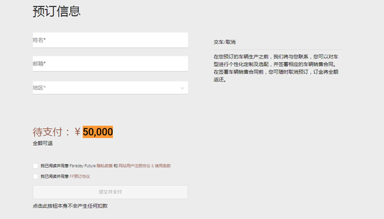 法拉第未来官网显示,FF 91已开始接受预定,预定金为5万元,全额可退。