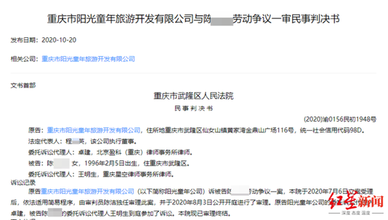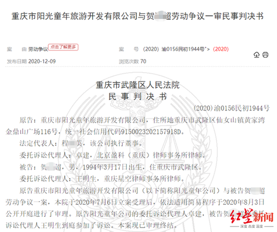 “法院的判决内容说的很明确,公司开除贺某超等人的行为缺乏依据,不具有合法性,属违法解除劳动合同。”3月25日,贺某超等人的代理律师,重庆星空律师事务所律师王明生告诉红星新闻记者,法院的判决结果出来后,阳光童年公司就主动向贺某超等人履行了赔付义务。