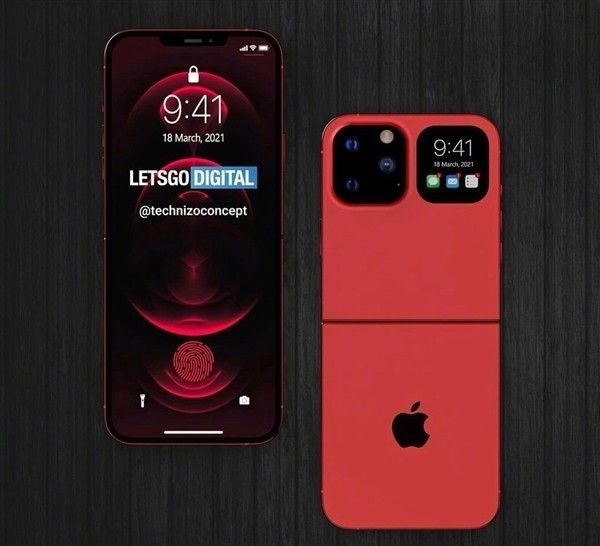 图中所示,iPhone Flip采用了与三星Galaxy Z Flip极为相似的设计方案,翻盖的“化妆盒”设计也非常便于携带带来更小的体积,这也是目前市面上非常受欢迎的折叠屏方案。