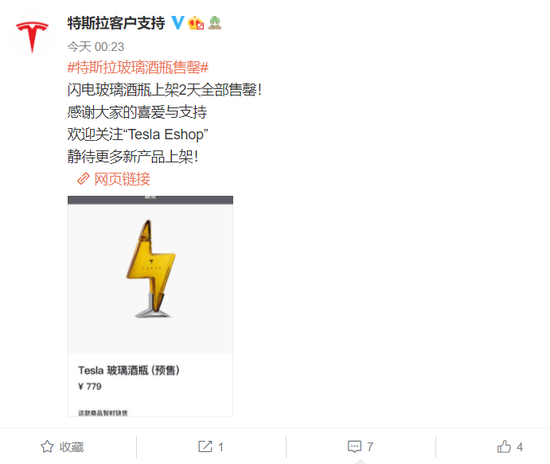 今日,特斯拉官方表示:“闪电玻璃酒瓶上架2天全部售罄”。目前,特斯拉空玻璃酒瓶官网呈暂时缺货状态。