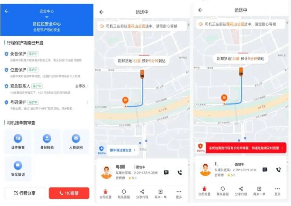 为了第一时间识别路径偏航、长时间停留等异常状况,货拉拉还在跟车订单场景中上线了“行程位置保护”功能。