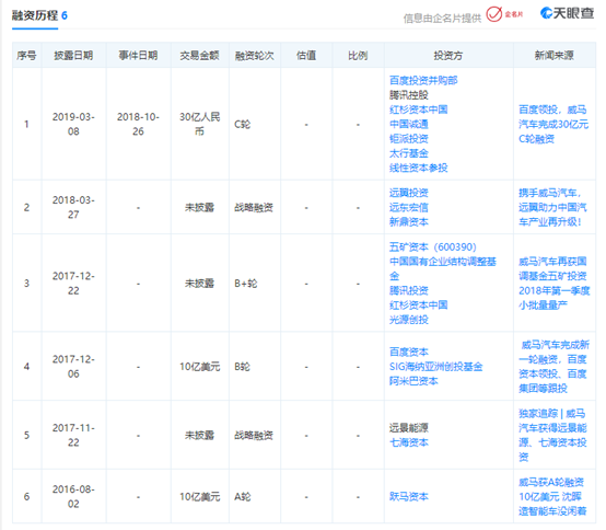 天眼查资料显示,威马汽车此前获得6次融资,最新一轮是在2018年10月,获得百度领投、腾讯控股、红杉资本中国等投资的30亿元。威马汽车表示融资将主要用于用户体验与技术研发。截至目前,威马汽车累计融资金额已近230亿元人民币。