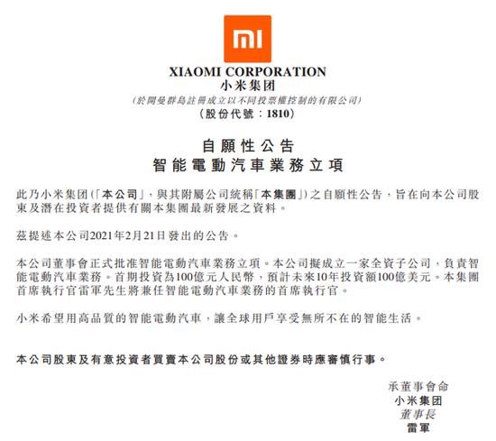 炣燃科技3月31日讯(安迪)有消息称小米计划未来三年投资约1000亿元人民币(150亿美元)生产电动汽车。小米集团确认了此事。该集团在港交所发布公告称,小米集团拟成立一家全资子公司,负责智能电动汽车业务。首期投资为100亿元,预计未来10年投资额100亿美元。小米集团首席执行官雷军将兼任智能电动汽车业务的首席执行官。