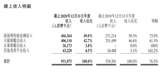 从贡献营收的具体渠道来看,2019年度线上渠道的收入5.39亿,2020年实现了9.52亿收入,营收增速为76.5%,表现出色。与零售店收入39.9%的占比相较,线上渠道的收入将近与线下零售店持平。
