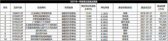 在一季度混合型基金排名的最后十名中,除了2018年9月成立的汇安裕阳三年定开基金,其余均是2021年以来新成立的基金。其中,今年1月20日成立、首发规模合计近80亿的华泰柏瑞质量领先也位列黑榜。