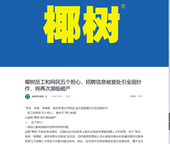 原文如下:椰树员工和网民五个担心,招聘信息被查处引全国炒作,将再次濒临破产