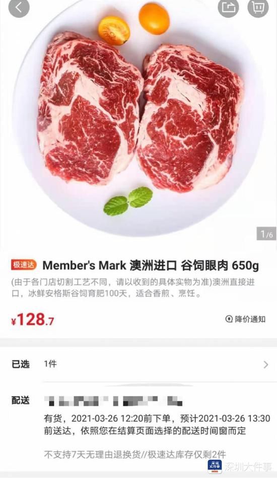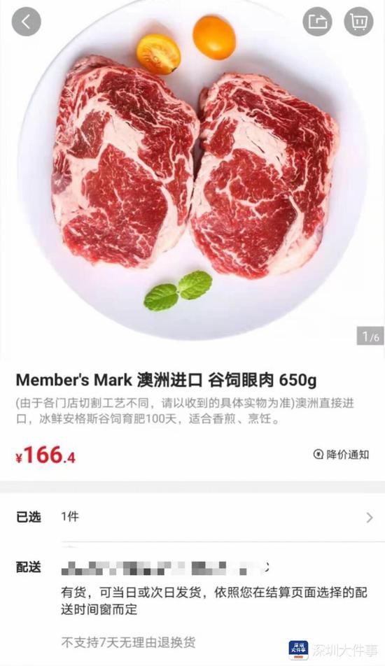 消费者王女士表示,其在3月25日前后脚下单的两份订单中,除了小区地址不同,下单的商品完全一致,均为650g装的Member’s Mark澳洲进口谷饲眼肉。然而在下单地址为南山华侨城某高端住宅时,商品价格为166.4元;而在下单地址为罗湖区某小区住宅时,商品价格则为128.7元。而两张订单中,均清晰指出配送费为0元、包装为1元,也就是说价格的差异就是来自于同款商品;商品价格相差幅度近30%。