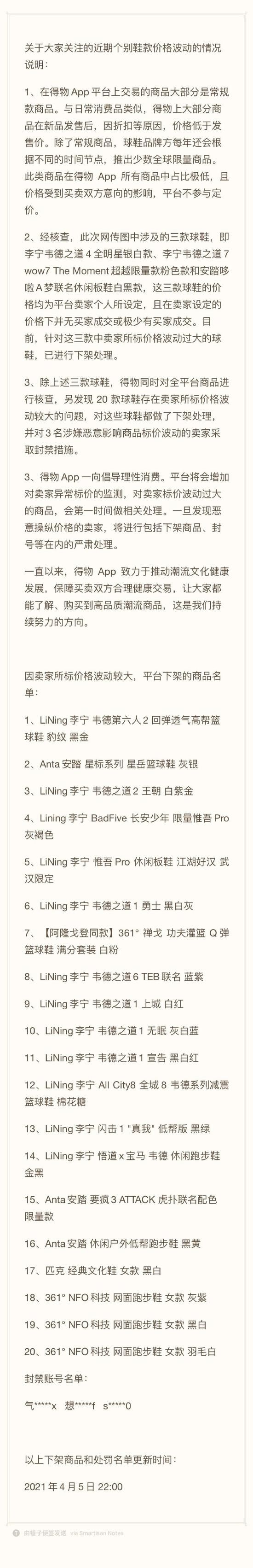 3、除上述三款球鞋,得物同时对全平台商品进行核查,另发现20款球鞋存在卖家所标价格波动较大的问题,对这些球鞋都做了下架处理,并对3名涉嫌恶意影响商品标价波动的卖家采取封禁措施。