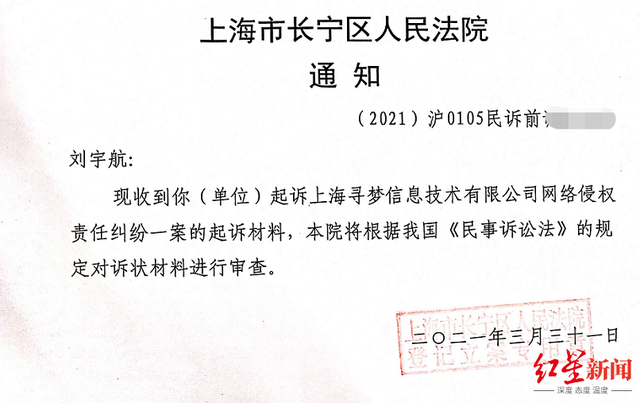 2021年3月31日,上海市长宁区人民法院已对该起诉材料进行审查,并将进行诉前调解。
