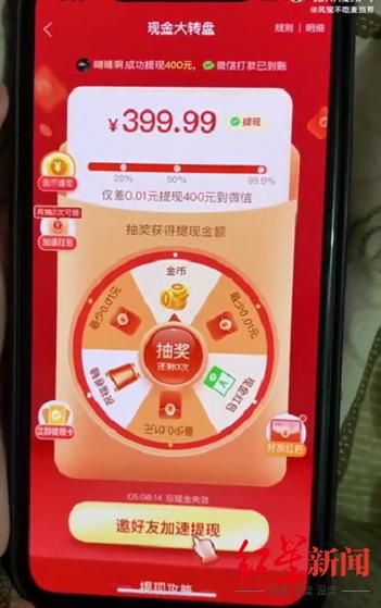 “仅差0.01元提现400元到微信。”一名女网友录下自己通过多种方法都无法获得拼多多“现金大转盘”奖励的视频近日也引发网友热议。视频中,这位女网友称一个朋友发给她一个拼多多“助力”的链接,网友帮助朋友后自己也参与了该活动,画面显示,在拼多多现金大转盘的活动中,如果获取抽奖机会,即可抽取转盘中的“最少0.01元”“金币”“现金红包”“祝福卷轴”。网友通过抽奖的方式获得399.99元,仅差0.01元就可以提现400元到微信。