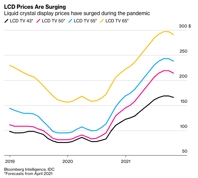 显示驱动芯片的短缺导致了液晶面板价格的飙升。去年1月到今年3月,一块50英寸液晶电视面板的售价增长了一倍。彭博行业研究分析师马修·坎特曼(Matthew Kanterman)预计,液晶面板价格将不断上涨,一直持续到今年第三季度。他指出,显示驱动芯片遭遇了“可怕的短缺”。