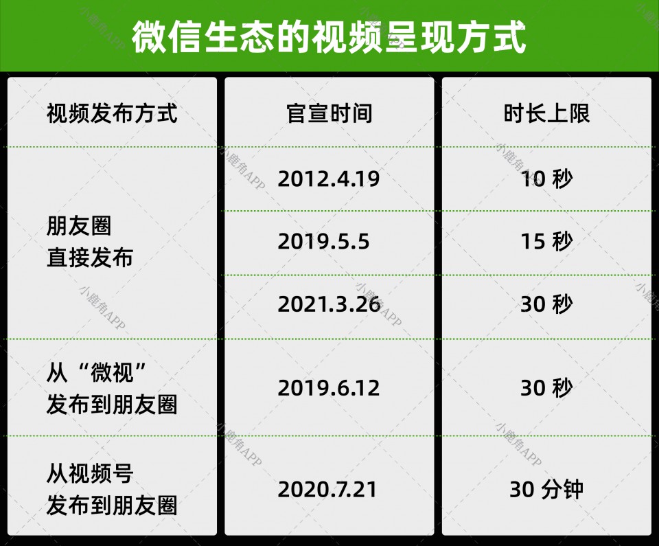在“微视”与微信打通后,2019年6月,用户想要发布15秒以上的视频,需先发布至微视App中,再分享回微信朋友圈,且视频自带微视水印。2020年7月,长视频可从视频号发布至朋友圈,时长支持30分钟,不过观看完整视频需跳转回视频号。