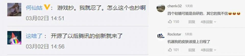 再看看自家“土狗”,有网友对腾讯“MAX”讲起了段子:“机器狗的皮肤该提上日程了”暗讽王者荣耀。也有网友犀利地直说:“游戏抄,我就忍了,怎么这个也抄啊”。