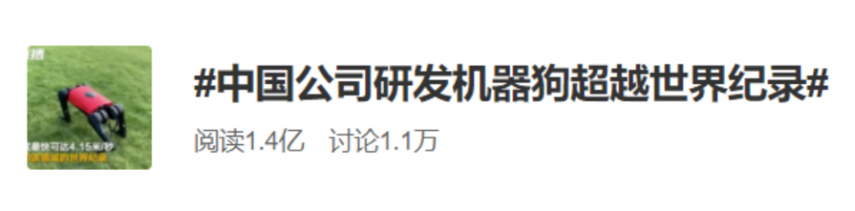 名为#中国公司研发机器狗超越世界纪录#的话题登上微博热搜,获得1.4亿阅读。