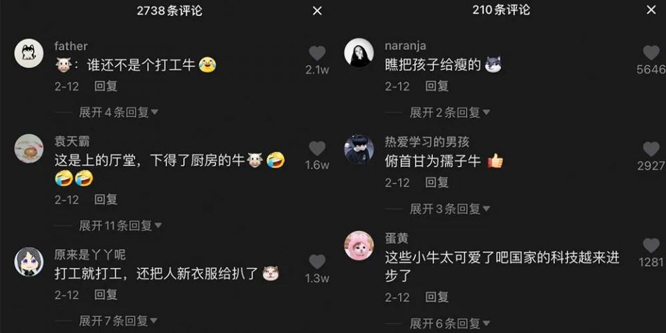 网友们大呼:“这是上的厅堂,下得了厨房的牛。”也有网友自嘲:“谁还不是个打工牛”、“打工就打工,还把人新衣服给扒了”,引起上万点赞。