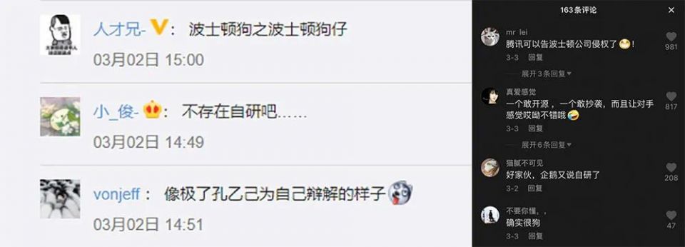 有网友讽刺到:“像极了孔乙己为自己辩解的样子”、“腾讯果然擅长借鉴和改良”,有人直接称“波士顿狗之波士顿狗仔。”