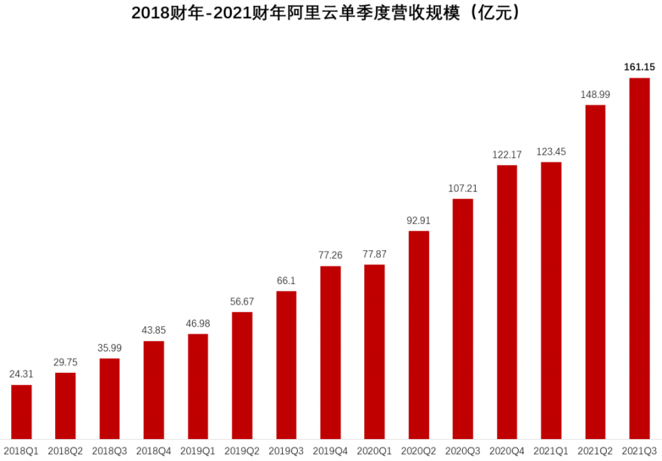 过去5年间,阿里云的营收规模增长接近30倍,阿里云在4年内单季度营收从10亿元提升到100亿元,而亚马逊却用了6年时间。