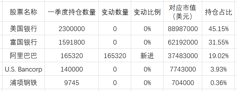 文件显示,截至2021年一季度末,Daily Journal共持有5只股票,持有16.5万股阿里巴巴股票,持仓市值3748.3万美元,占比19.02%。另外,Daily Journal还有持有美国银行、富国银行、U.S. Bancorp、浦项钢铁,持仓数量都没有变化,第一大重仓股美国银行,占比接近50%。