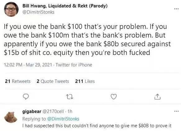 此前,号称来自“Bill Hwang”的社交媒体发声在网络流传,并被众多媒体引用。此“Bill Hwang”说,如果你欠银行100美元,这是你的问题。如果你欠银行1亿美元,这是银行的问题。但显而易见的是,如果你因为担保价值150亿美元的股票,而欠银行800亿美元,你和银行都完蛋了。Archegos资本公关表示,诸如此类社交媒体发声并非来自Bill Hwang。