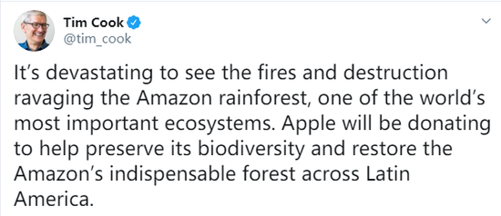 库克发布的推文表示,“这样的火灾和破坏是毁灭性的,它正在破坏世界上最重要的生态系统之一亚马逊雨林。苹果公司将捐款来帮助保护这里的生物多样性,并帮助恢复整个拉丁美洲亚马逊地区不可或缺的森林覆盖。”