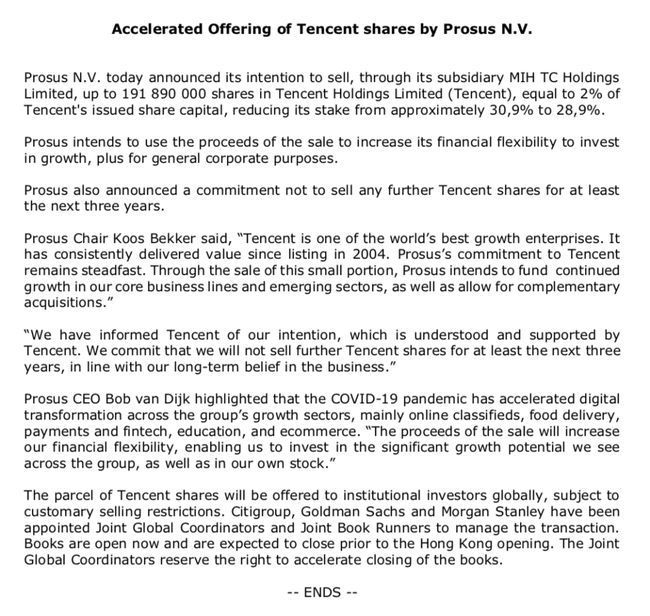 Prosus称,这批腾讯股票将在全球范围内向机构投资者发售。花旗集团、高盛和摩根士丹利已被任命为联合全球协调员和联合账簿管理人,以管理这笔交易。