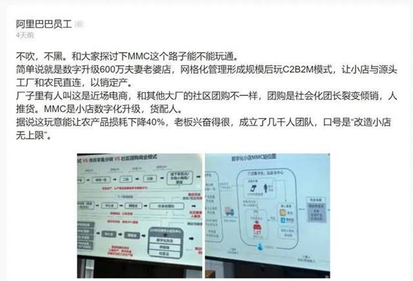 近日,脉脉一个显示为“阿里巴巴员工”的用户,发帖泄露了阿里MMC事业群的真面貌——从图中显示,这一MMC事业群模式的社区经营新思路被称为“近场电商”,核心使命是赋能升级600家夫妻小店,实现“货配人”。