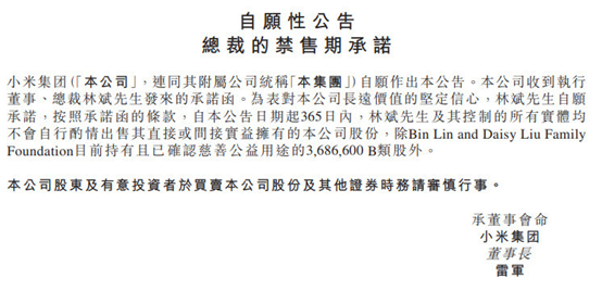 小米集团早间发布公告称,公司总裁林斌自愿承诺,按照承诺函的条款,自本公告日期起365日内,自己及其控制的所有实体均不会自行酌情出售其直接或间接实益拥有的本公司股份。