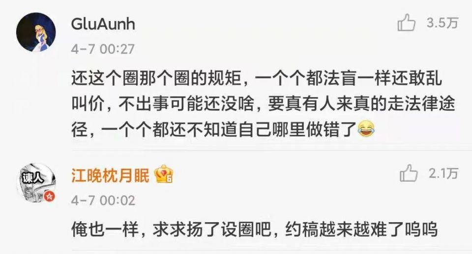 拥有近百万粉丝的微博画手“鱼总”在此事件发生后发微博表示,“设圈全是缝合怪”。CG画家“乌合麒麟”也在微博上称,不能理解圈子里的各种“规矩”,这些圈层规则就是为了“骗小孩钱”。
