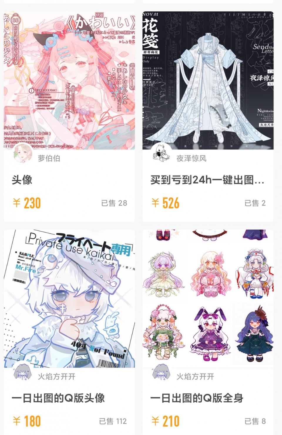 米画师平台上人设图售卖界面
