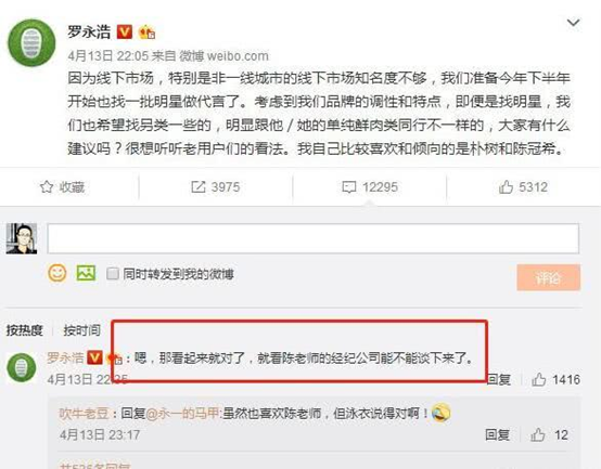 今年4月份,罗永浩就表示有机会的话会找陈冠希做其代言人。罗永浩称,准备在今年下半年找明星代言,但考虑到自家品牌的调性和特点,因此想请另类一些的明星,随后罗永浩给出了自己的心中人选:朴树和陈冠希。之后罗永浩在评论区回复称,“就看陈老师的经纪公司能不能谈下来了”。