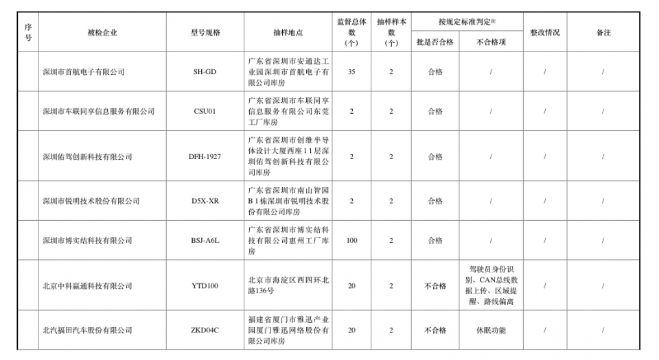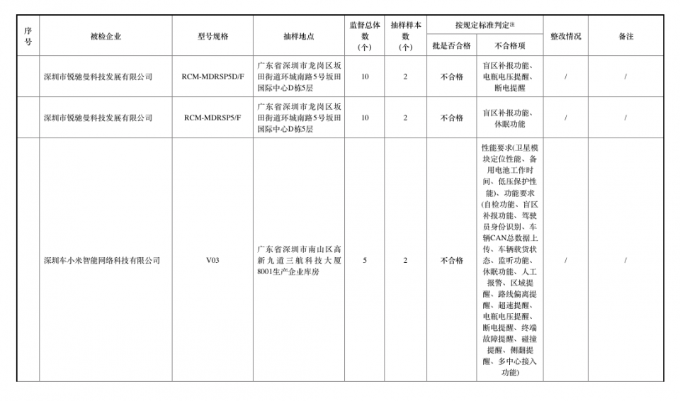 从被检企业的不合格项来看,例如深圳车小米智能网络科技有限公司一型号规格抽样样本不合格,不合格项包括性能要求和功能要求。其中性能要求包括卫星模块定位性能、备用电池工作时间、低压保护性能;功能要求包括自检功能、盲区补报功能、驾驶员身份识别、车辆CAN总数据上传、车辆载货状态、监听功能、休眠功能、人工报警、区域提醒、路线偏离提醒、超速提醒、电瓶电压提醒、断电提醒、终端故障提醒、碰撞提醒、侧翻提醒、多中心接入功能。
