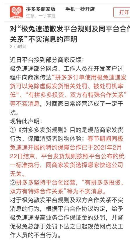 ①《拼多多发货规则》目的是规范商家发货行为、保障消费者购物体验;春节期间同极兔速递开展的特约保障合作已于2021年2月22日结束,平台发货规则按照平台公布的统一标准执行,同商家发货选择哪家快递公司无关。