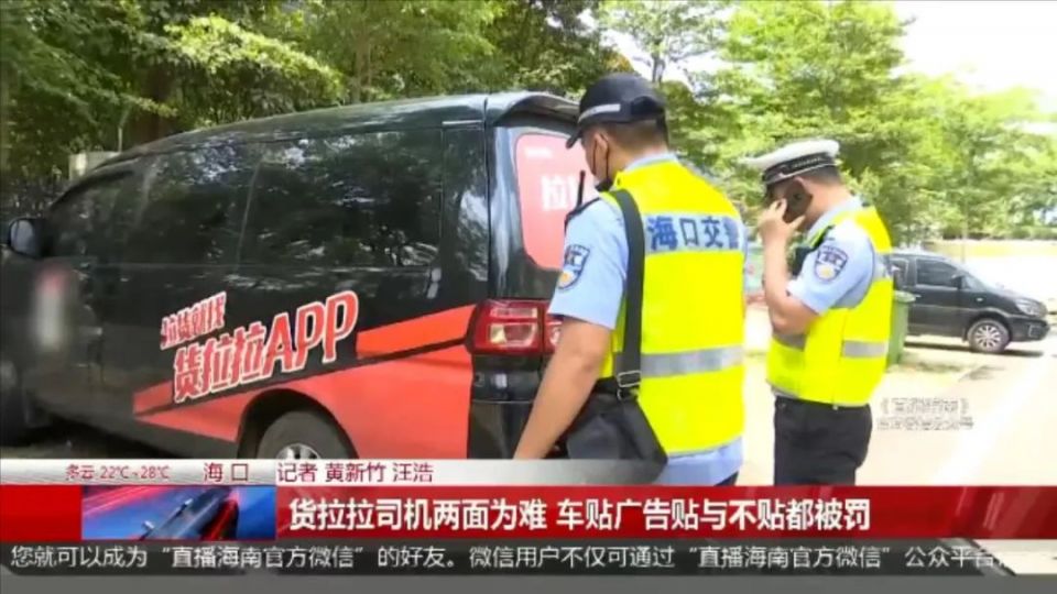 直播海南微信公号4月11日消息,海口的王师傅是一名货拉拉司机。按照公司要求,司机需要在车身粘贴货拉拉的标语和二维码等广告。可实际情况是,按公司要求贴了车贴广告,会被交警罚款;不贴,又会被公司罚款。于是,一直以来,王师傅都不知该如何是好!