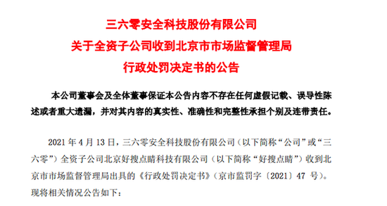 商业 360回应被罚200万:罚款已及时缴纳 2021-04-14 09:58:51 分享 来源:新浪科技4月13日晚间消息,三六零公告称,北京市市场监督管理局对好搜点睛(360搜索)处以罚款200万元的行政处罚。三六零诚恳接受并坚决服从上述处罚决定,已按照相关要求于2021年4月13日及时缴纳罚款,罚款金额将计入当期损益,对公司经营业绩不会产生重大影响。