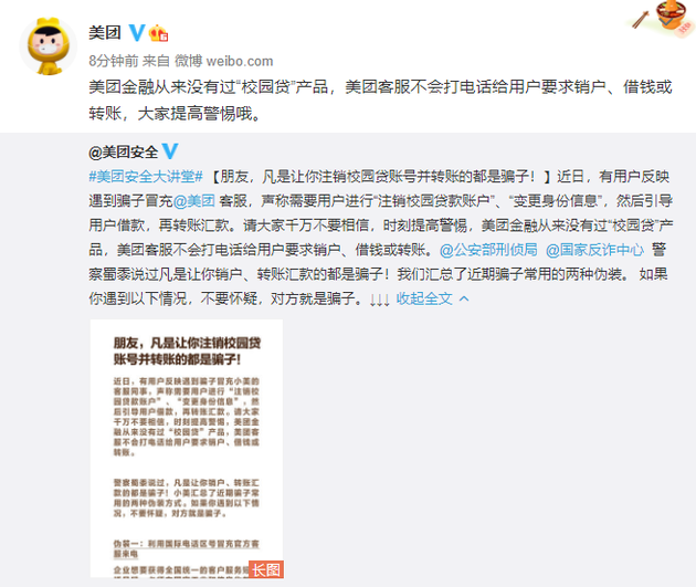 商业 美团金融表示从无校园贷产品 2021-04-14 09:57:37 分享 来源:新浪科技4月13日下午消息,美团微博表示,美团金融从来没有过“校园贷”产品,美团客服不会打电话给用户要求销户、借钱或转账。